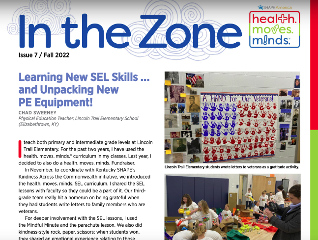 Congratulations to former KYSHAPE Elementary Teacher of the Year Chad Sweeney from Hardin County’s Lincoln Elementary School! Chad’s tremendous success last school year with fundraising with health.moves.minds. earned him and his students recognition by SHAPE America’s In the Zone publication!